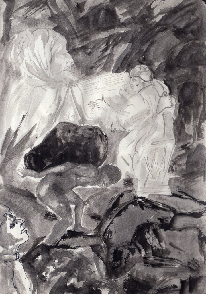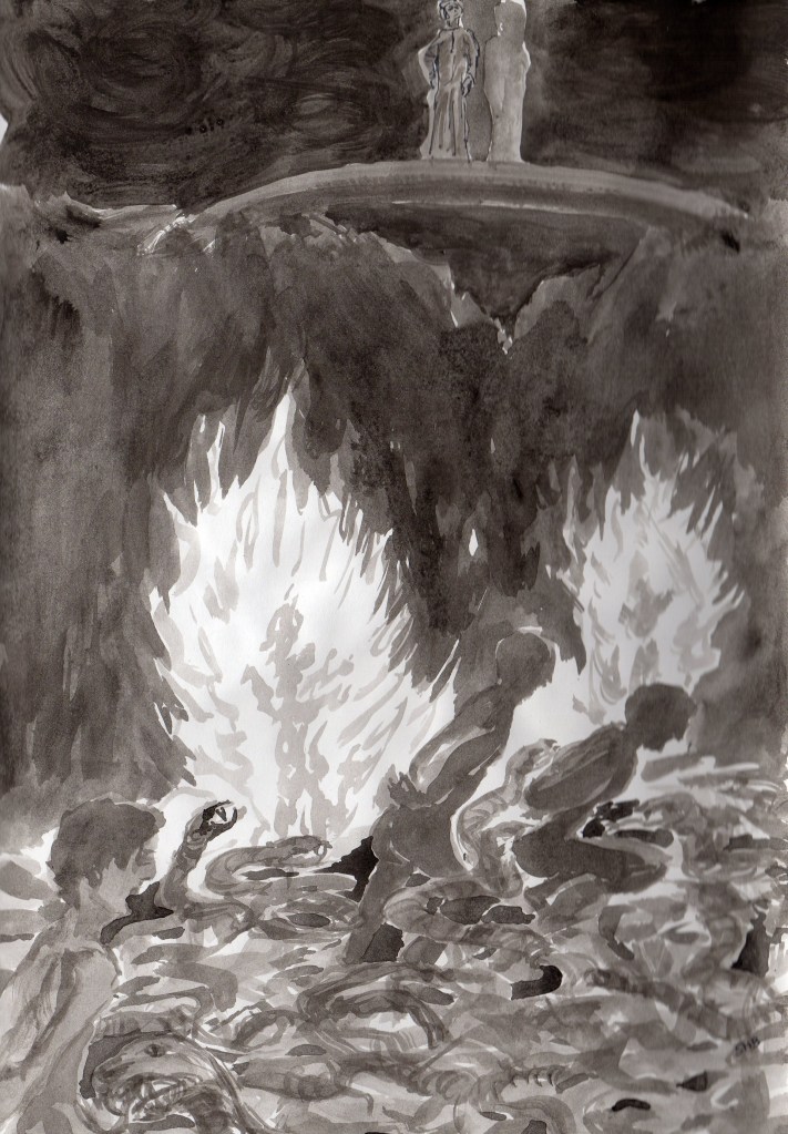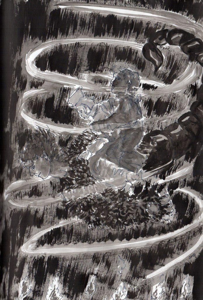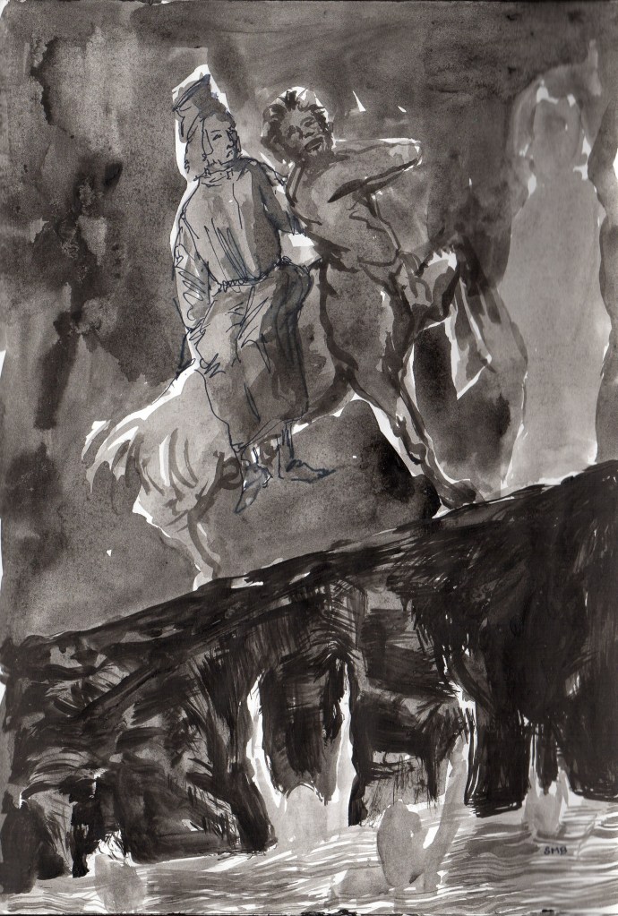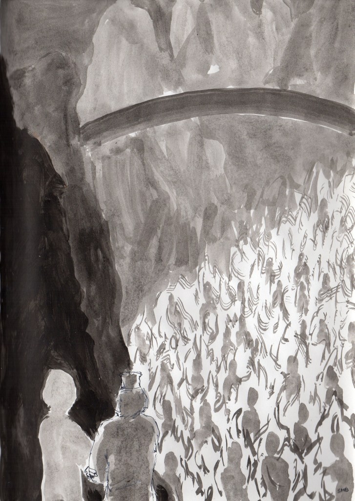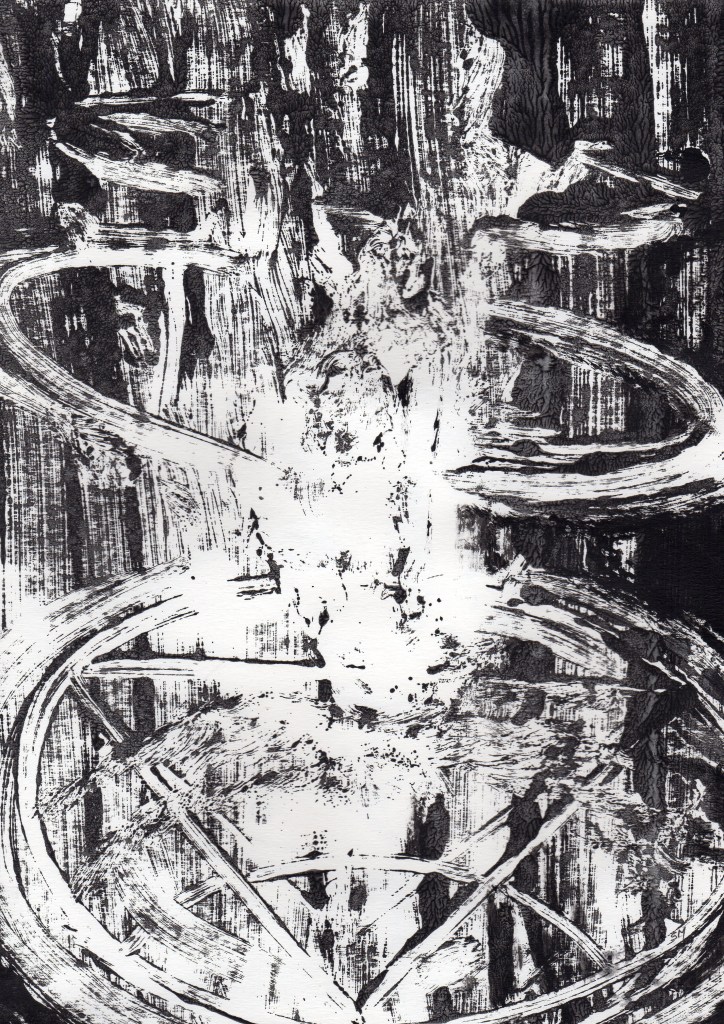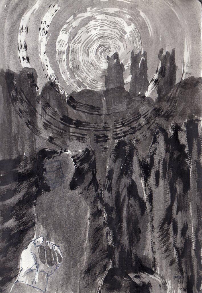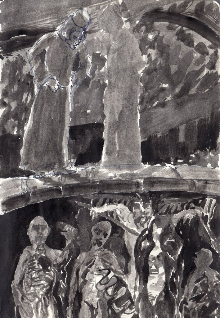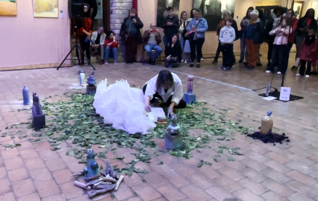 L’artiste chorégraphique Sophie Distefano évolue dans le public en lisant de manière aléatoire les premiers paragraphes des chants infernaux de la Divine Comédie de Dante. Sa déambulation musicale l’amène à mettre en valeur les différents cercles: