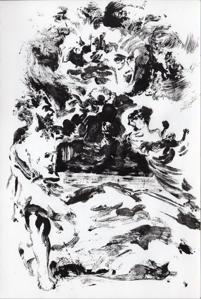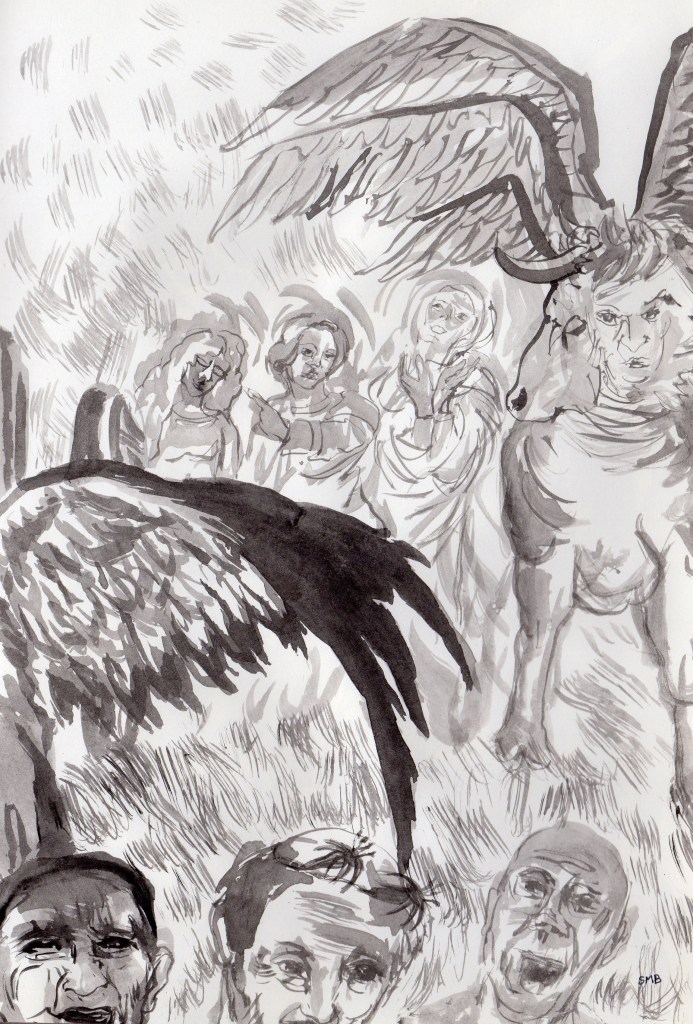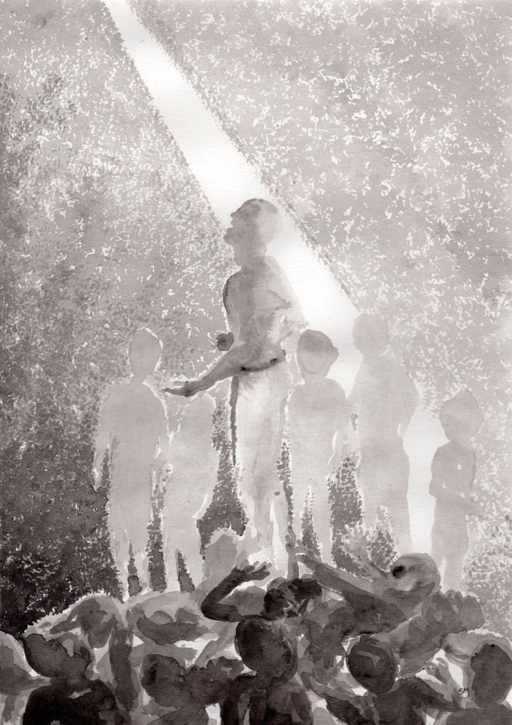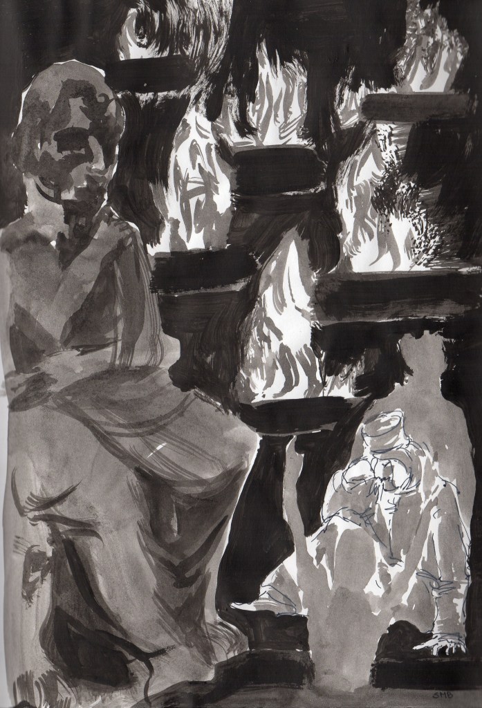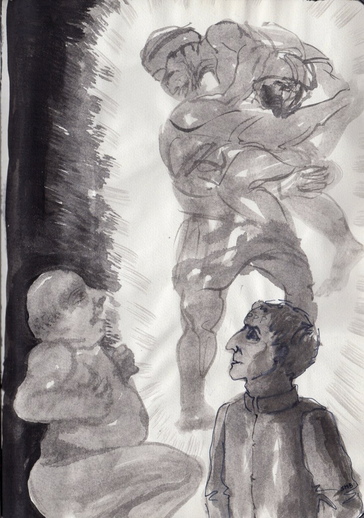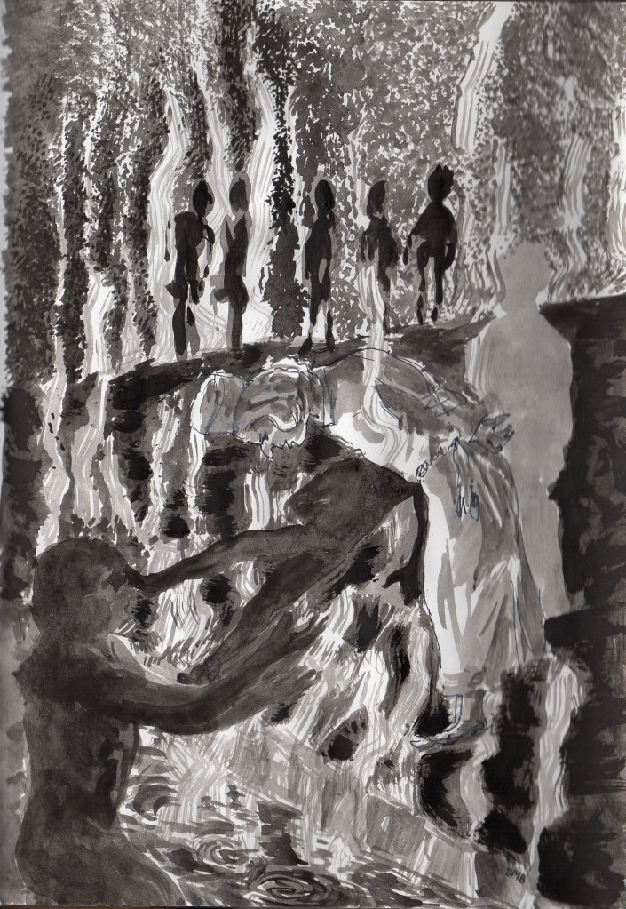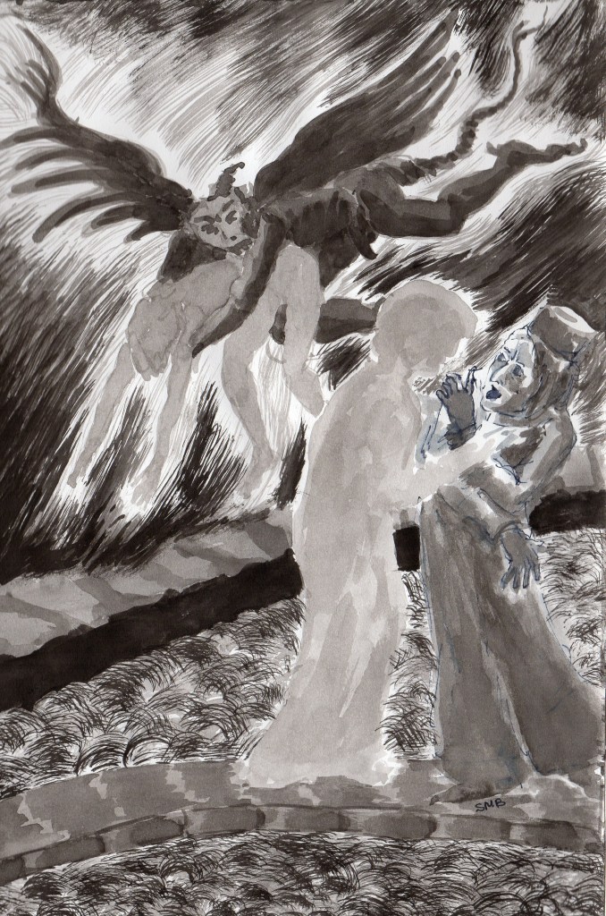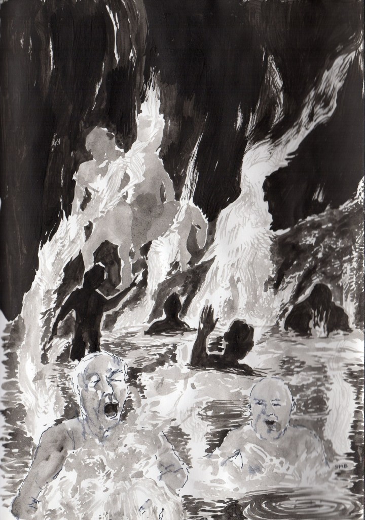 L’artiste chorégraphique Sophie Distefano évolue dans le public en lisant de manière aléatoire les premiers paragraphes des chants infernaux de la Divine Comédie de Dante. Sa déambulation musicale l’amène à mettre en valeur les différents cercles: