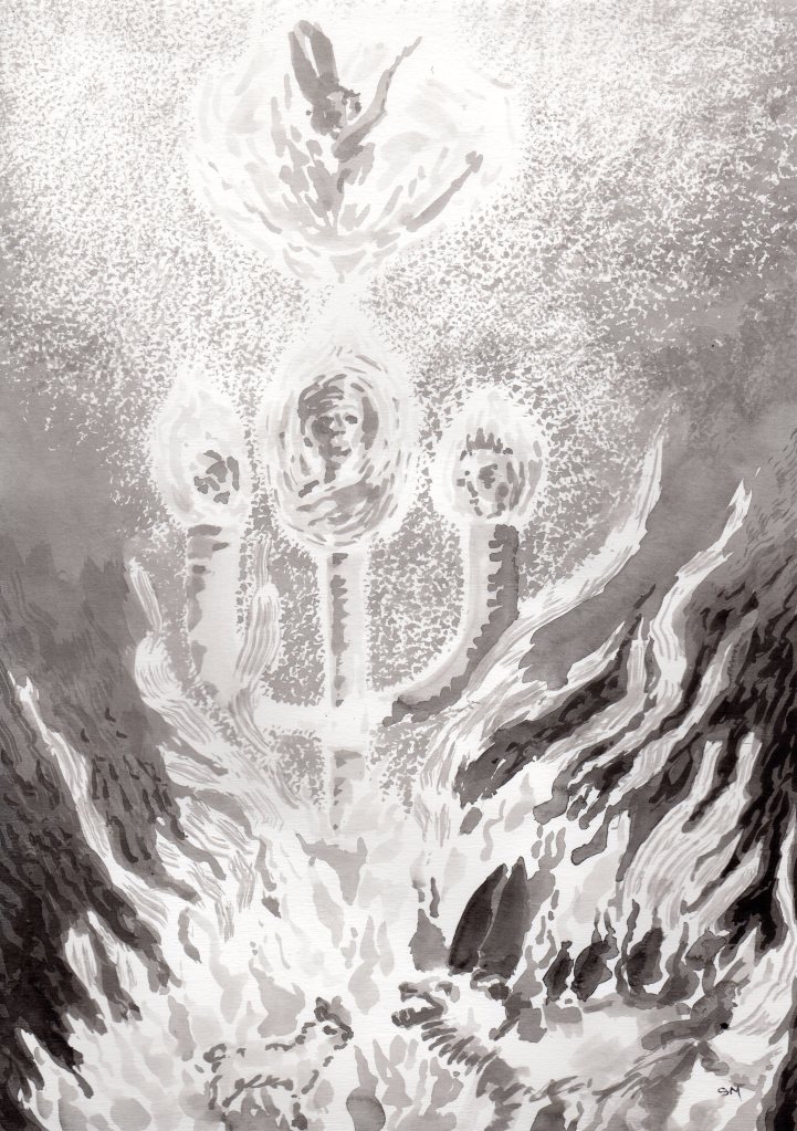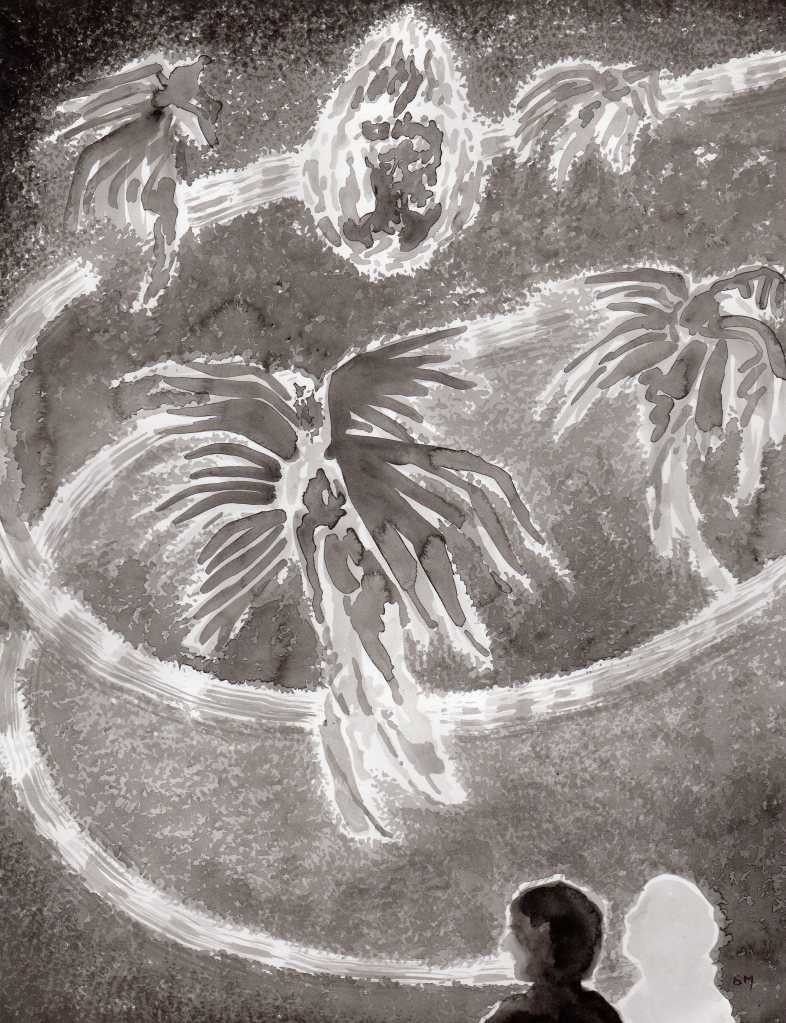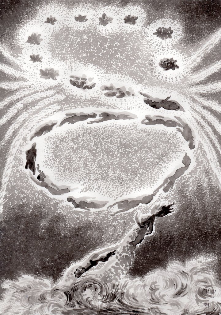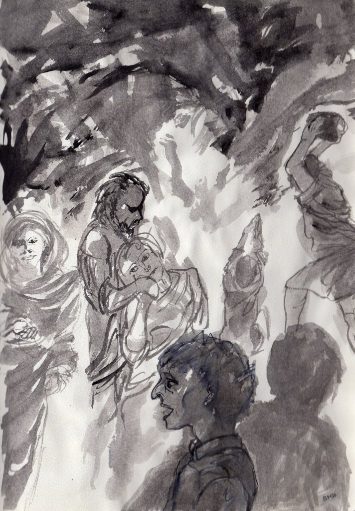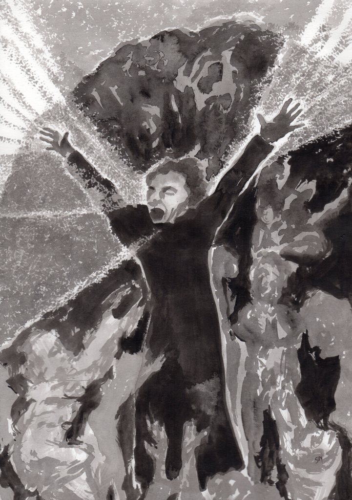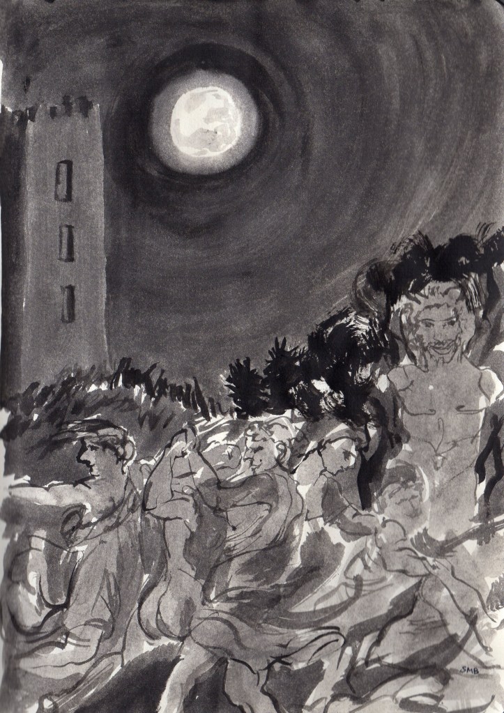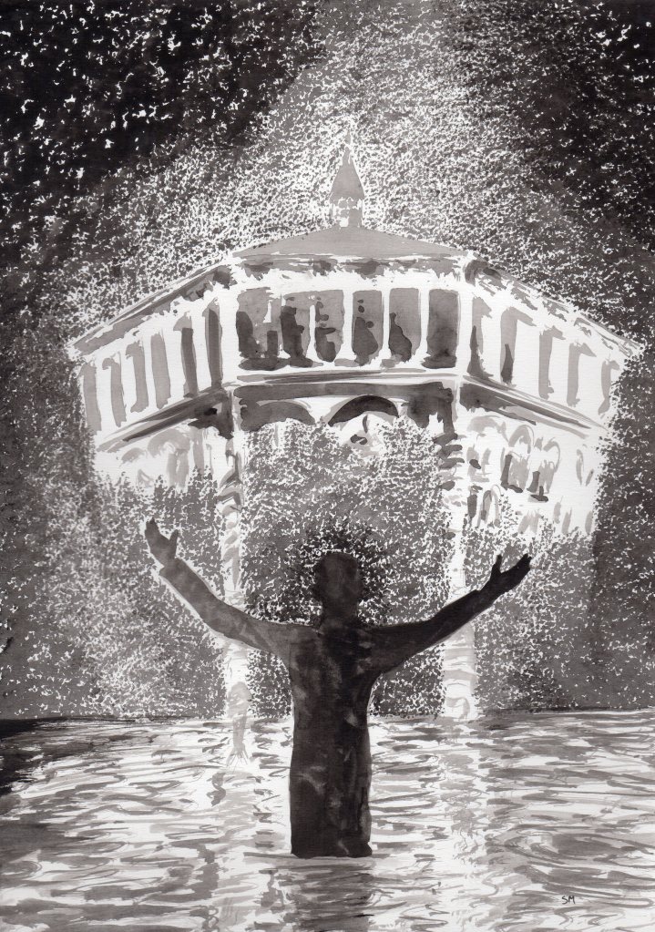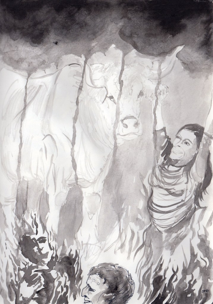 L’artiste chorégraphique Sophie Distefano évolue dans le public en lisant de manière aléatoire les premiers paragraphes des chants infernaux de la Divine Comédie de Dante. Sa déambulation musicale l’amène à mettre en valeur les différents cercles: