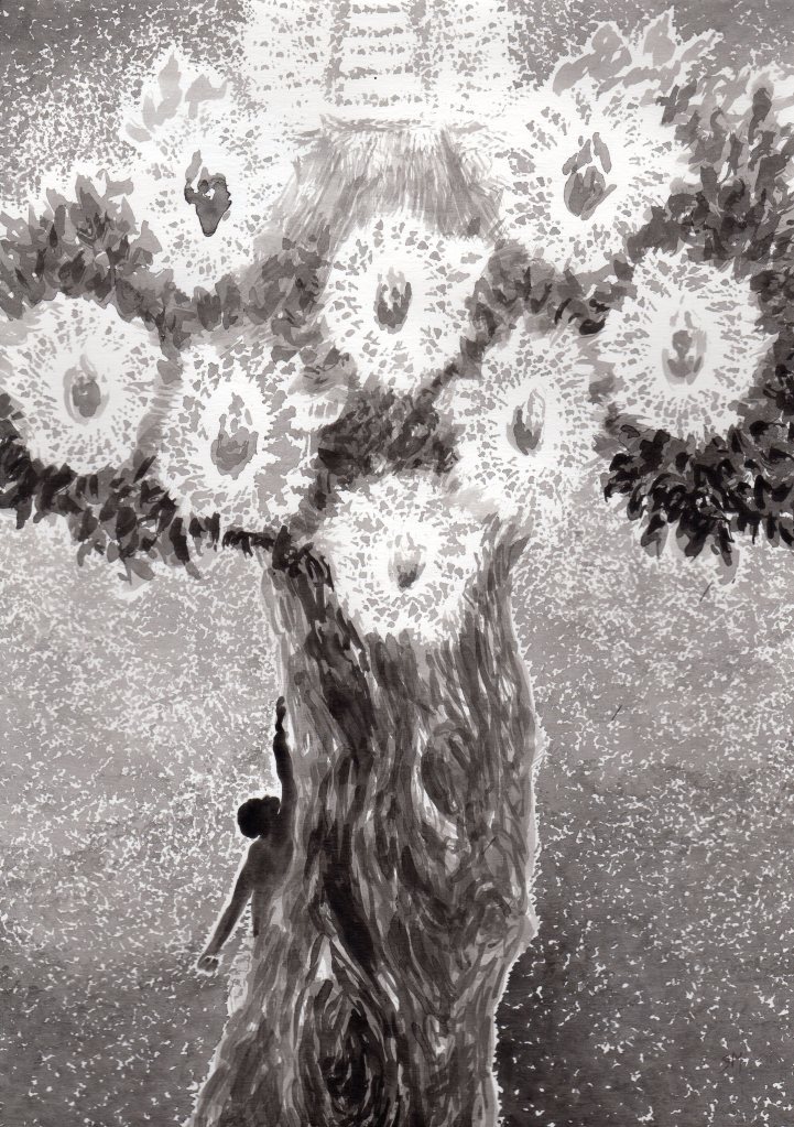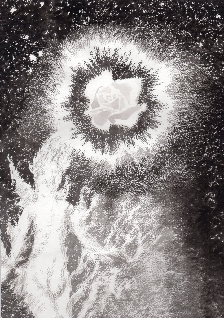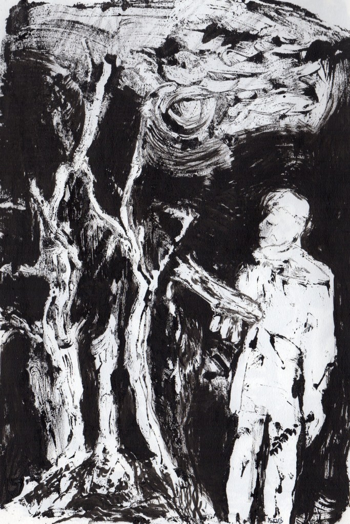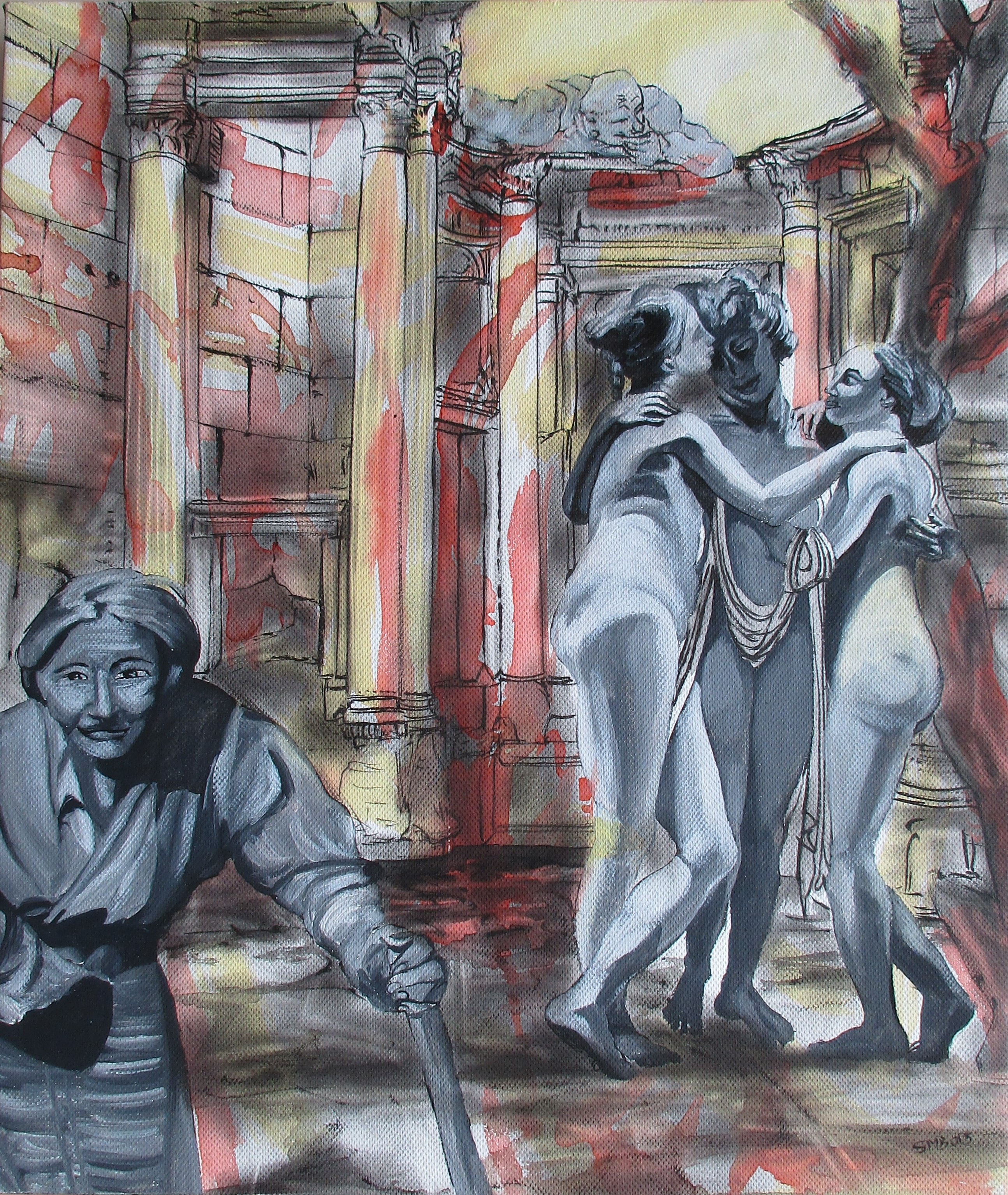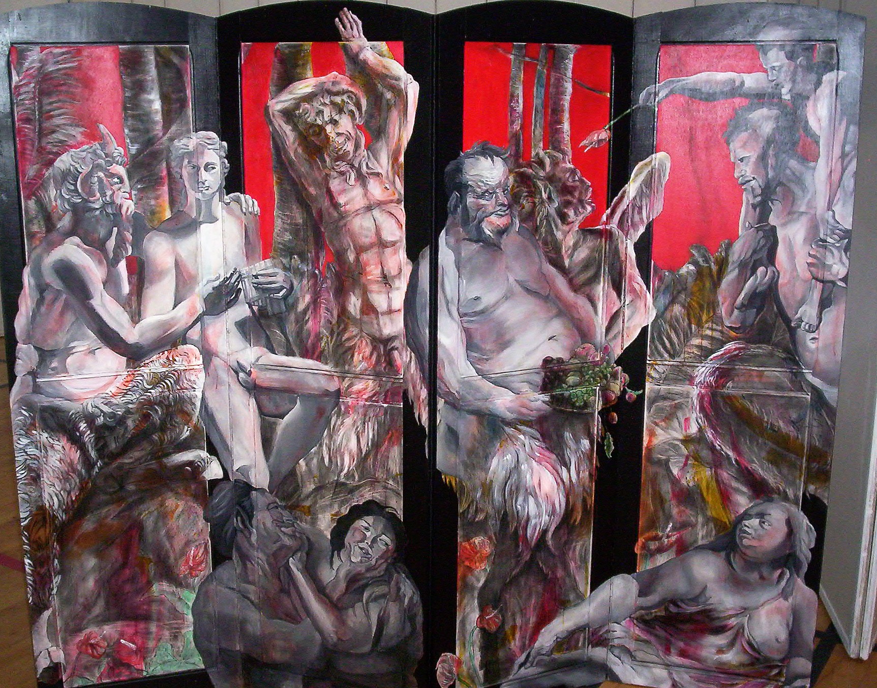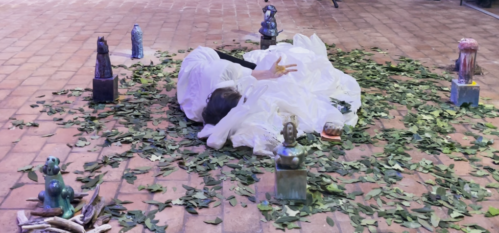 L’installation performative « Quand l’humain ferme les yeux » est fondée sur le modèle de la bipolarité apollinien-dionysien, cher à Friedrich Nietzsche et Aby Warburg. Sur un large tapis de feuilles de laurier et de lierre, l’humain est disposé au centre, recroquevillé et recouvert d’une bâche composée par des sacs en plastique blanc de boucherie, cousus de fil blanc. Son visage est tourné vers l’Est. 4 vases-canopes posés sur des cubes et situés aux 4 points cardinaux forment un premier cercle, celui de l’Amour Fraternel. Ils contiennent chacun des matières naturelles et prophylactiques: poivre noir, clous de girofle, sel marin, curcuma. 5 urnes funéraires constituent le deuxième cercle, celui du chaos, du doute, de l’hétérogénéité, de l’humain-citoyen. Ces urnes, placées aux pointes d’un pentagramme, sont celles des 5 Républiques Françaises. Leurs assises sont élaborées à partir du bois et de ses dérivés: cendres, charbon, bois flotté, bois sec. Elles conservent des mots et des phrases: