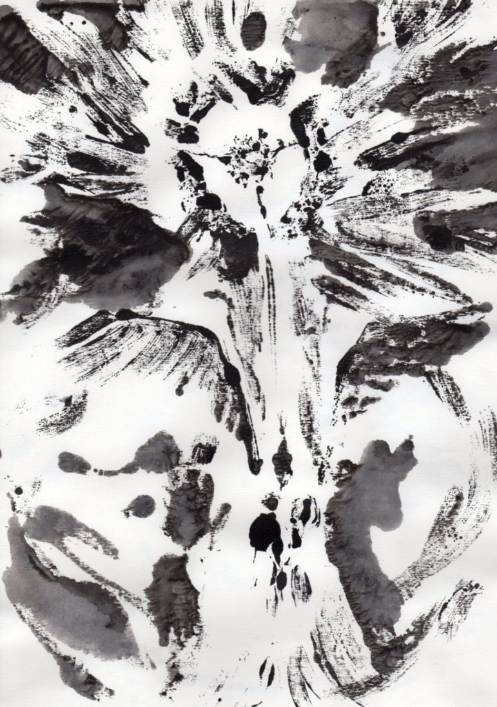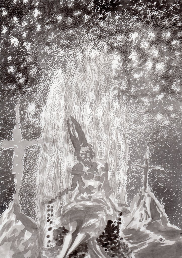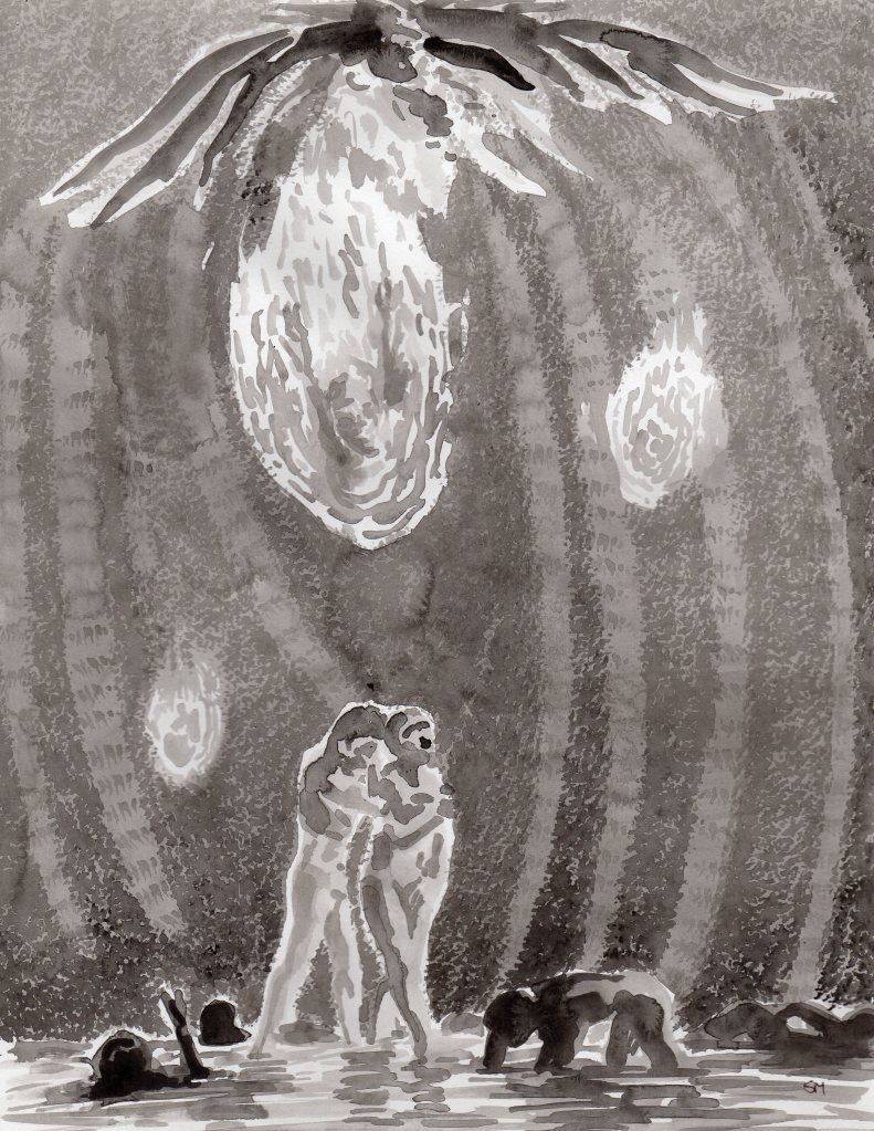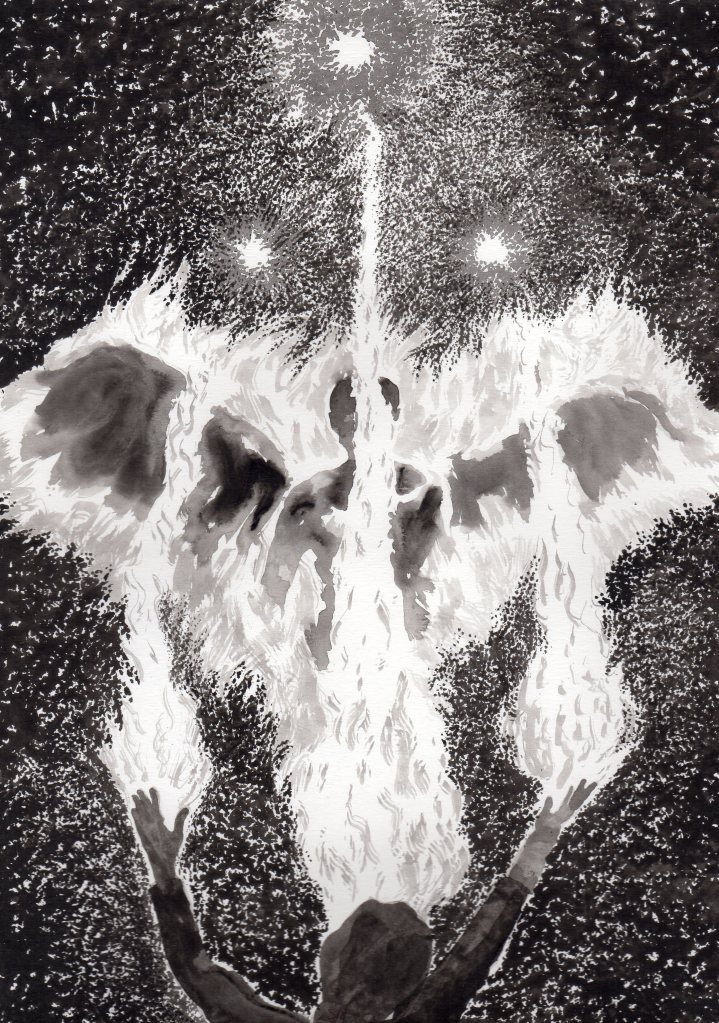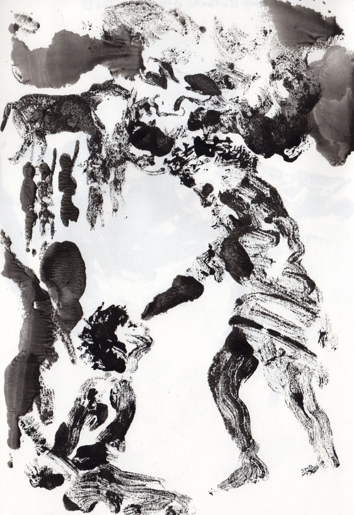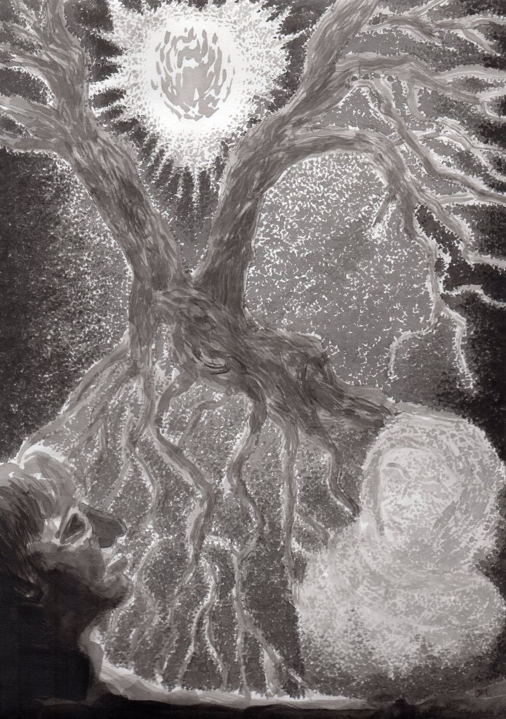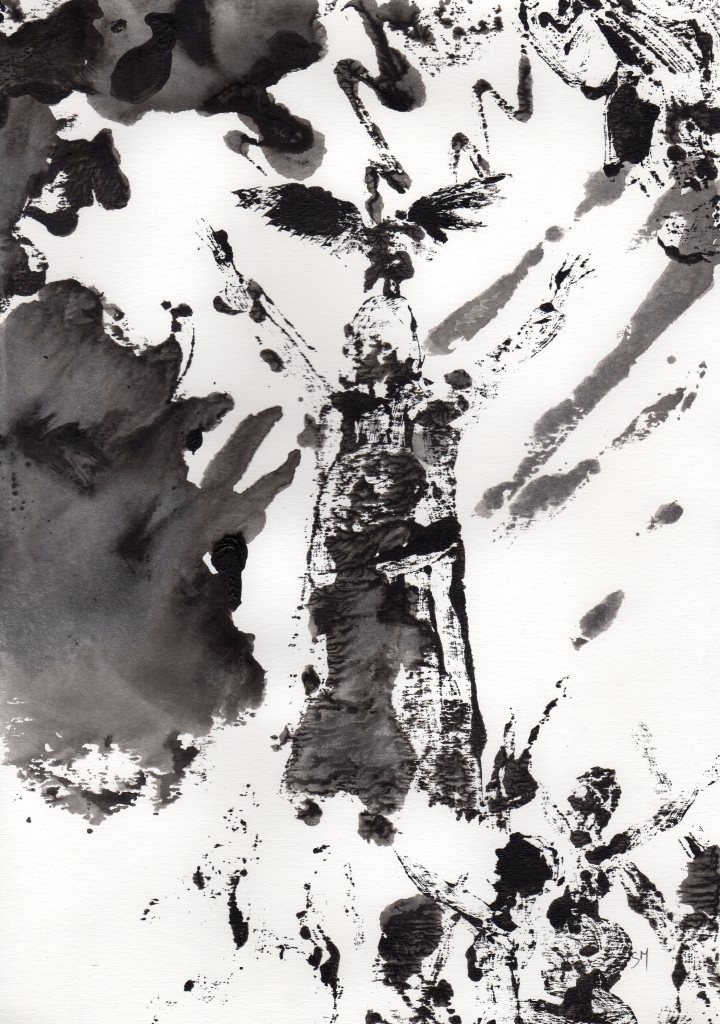 L’installation performative « Quand l’humain ferme les yeux » est fondée sur le modèle de la bipolarité apollinien-dionysien, cher à Friedrich Nietzsche et Aby Warburg. Sur un large tapis de feuilles de laurier et de lierre, l’humain est disposé au centre, recroquevillé et recouvert d’une bâche composée par des sacs en plastique blanc de boucherie, cousus de fil blanc. Son visage est tourné vers l’Est. 4 vases-canopes posés sur des cubes et situés aux 4 points cardinaux forment un premier cercle, celui de l’Amour Fraternel. Ils contiennent chacun des matières naturelles et prophylactiques: poivre noir, clous de girofle, sel marin, curcuma. 5 urnes funéraires constituent le deuxième cercle, celui du chaos, du doute, de l’hétérogénéité, de l’humain-citoyen. Ces urnes, placées aux pointes d’un pentagramme, sont celles des 5 Républiques Françaises. Leurs assises sont élaborées à partir du bois et de ses dérivés: cendres, charbon, bois flotté, bois sec. Elles conservent des mots et des phrases: