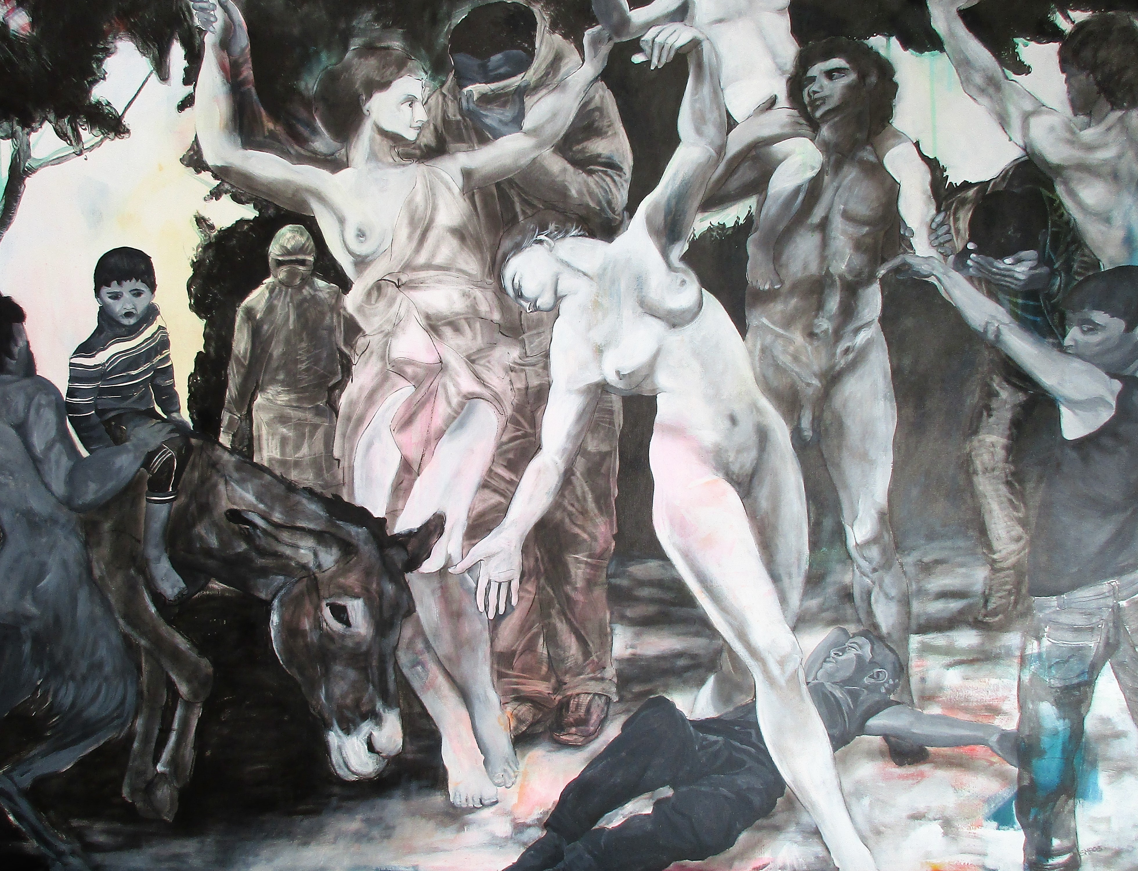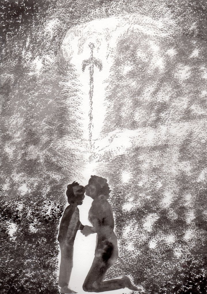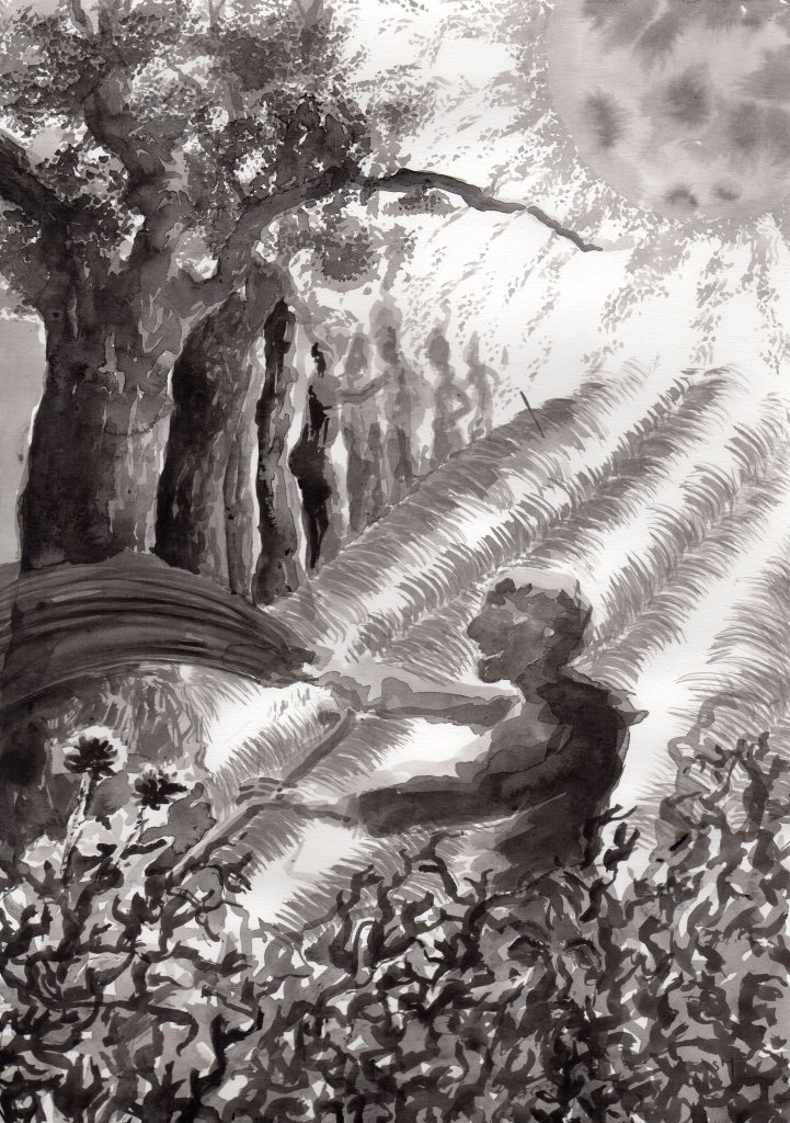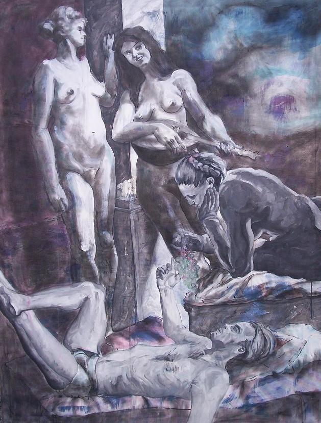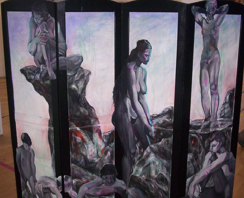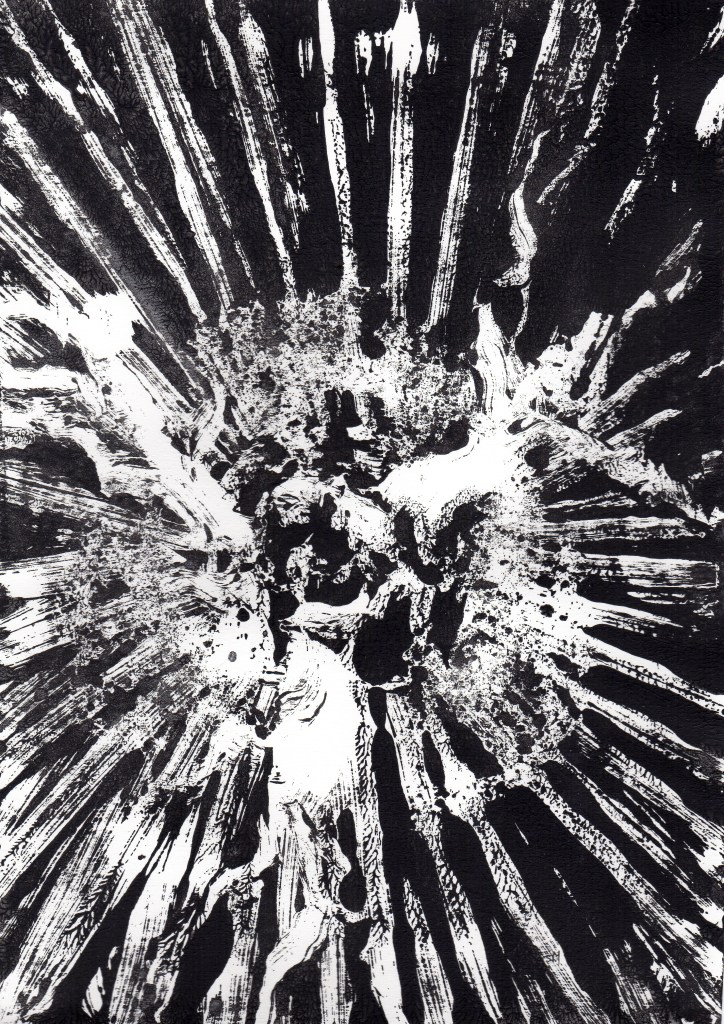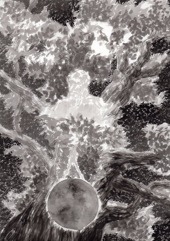 L’installation performative « Quand l’humain ferme les yeux » est fondée sur le modèle de la bipolarité apollinien-dionysien, cher à Friedrich Nietzsche et Aby Warburg. Sur un large tapis de feuilles de laurier et de lierre, l’humain est disposé au centre, recroquevillé et recouvert d’une bâche composée par des sacs en plastique blanc de boucherie, cousus de fil blanc. Son visage est tourné vers l’Est. 4 vases-canopes posés sur des cubes et situés aux 4 points cardinaux forment un premier cercle, celui de l’Amour Fraternel. Ils contiennent chacun des matières naturelles et prophylactiques: poivre noir, clous de girofle, sel marin, curcuma. 5 urnes funéraires constituent le deuxième cercle, celui du chaos, du doute, de l’hétérogénéité, de l’humain-citoyen. Ces urnes, placées aux pointes d’un pentagramme, sont celles des 5 Républiques Françaises. Leurs assises sont élaborées à partir du bois et de ses dérivés: cendres, charbon, bois flotté, bois sec. Elles conservent des mots et des phrases: