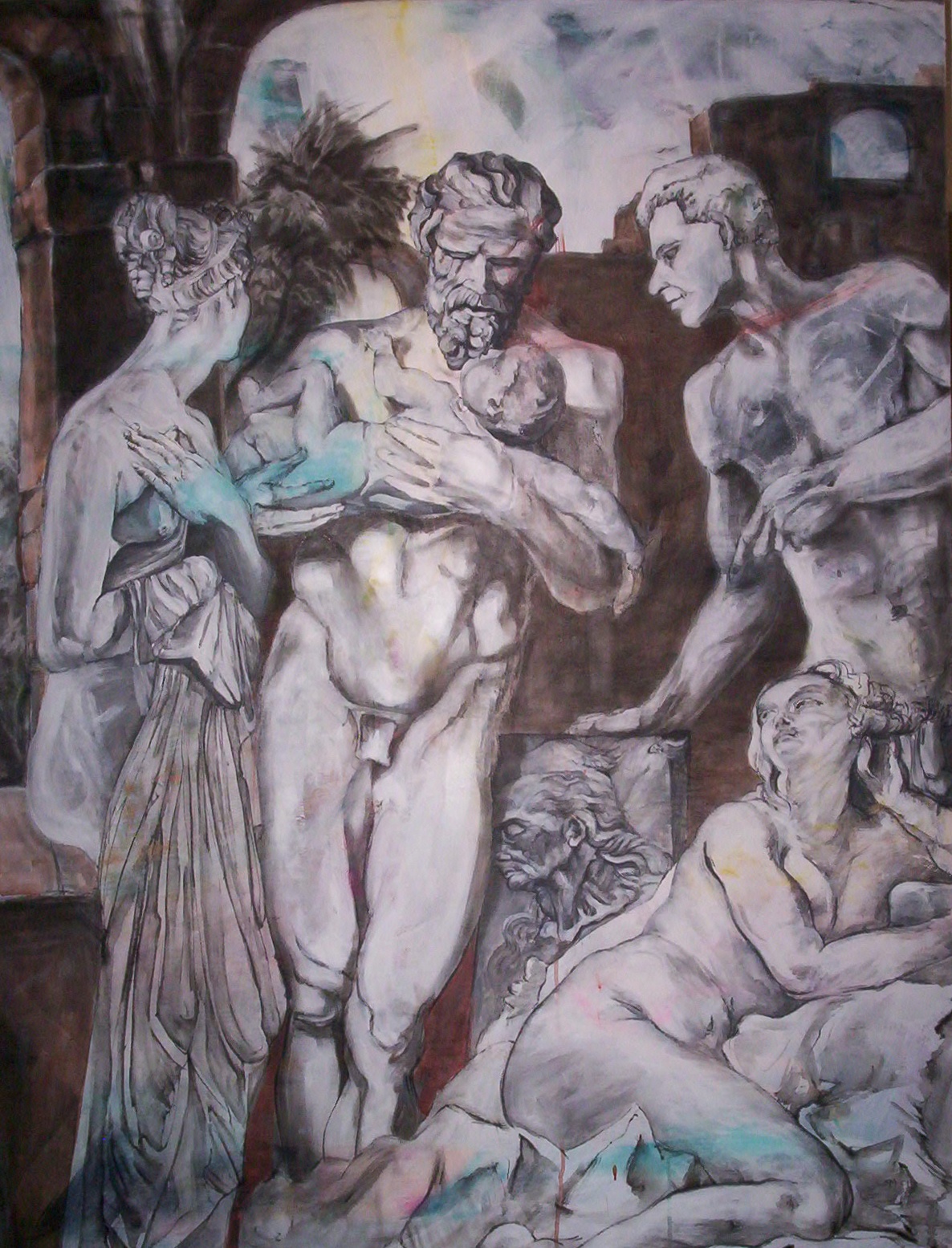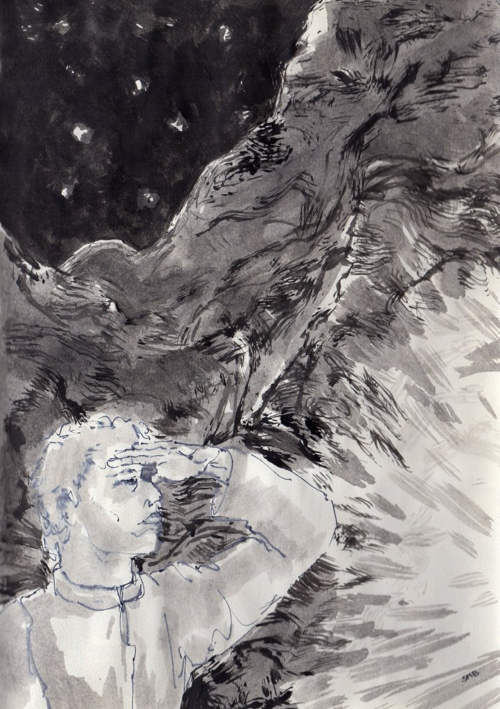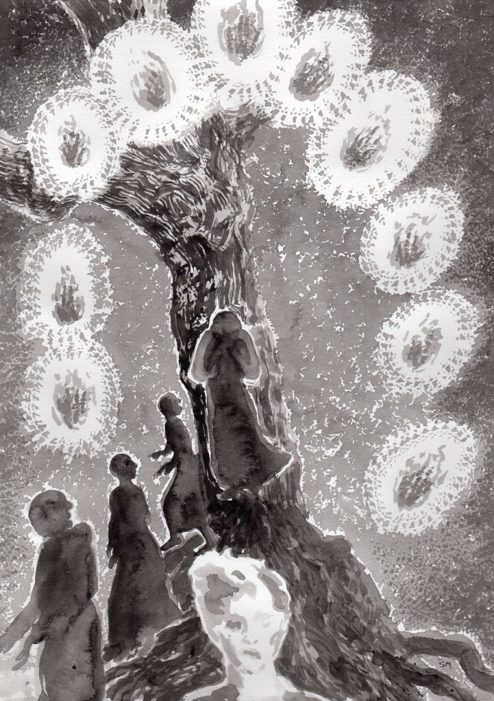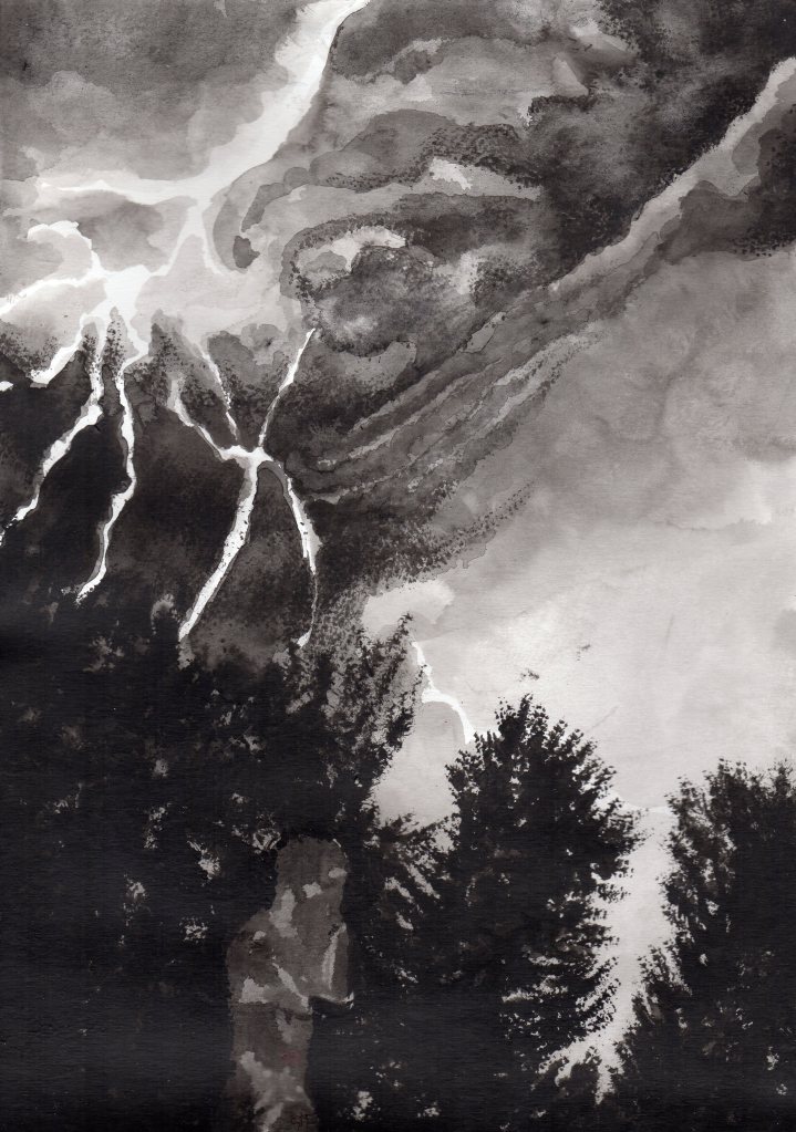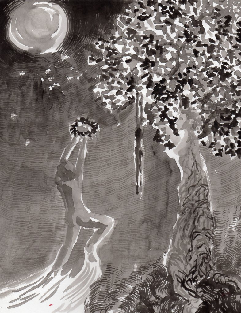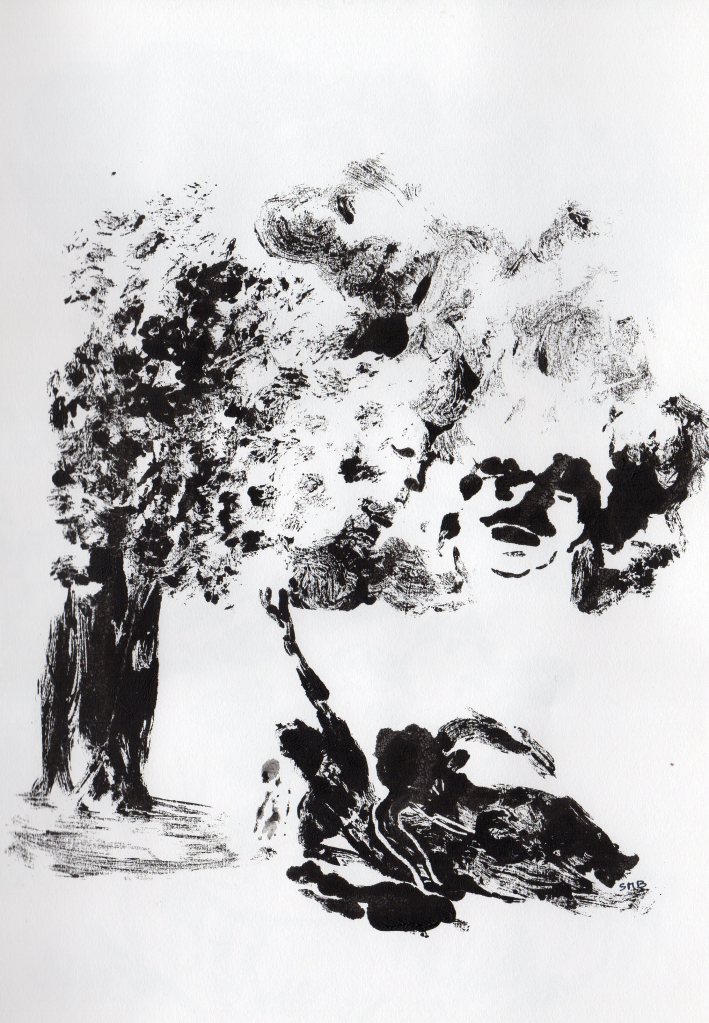 L’installation performative « Quand l’humain ferme les yeux » est fondée sur le modèle de la bipolarité apollinien-dionysien, cher à Friedrich Nietzsche et Aby Warburg. Sur un large tapis de feuilles de laurier et de lierre, l’humain est disposé au centre, recroquevillé et recouvert d’une bâche composée par des sacs en plastique blanc de boucherie, cousus de fil blanc. Son visage est tourné vers l’Est. 4 vases-canopes posés sur des cubes et situés aux 4 points cardinaux forment un premier cercle, celui de l’Amour Fraternel. Ils contiennent chacun des matières naturelles et prophylactiques: poivre noir, clous de girofle, sel marin, curcuma. 5 urnes funéraires constituent le deuxième cercle, celui du chaos, du doute, de l’hétérogénéité, de l’humain-citoyen. Ces urnes, placées aux pointes d’un pentagramme, sont celles des 5 Républiques Françaises. Leurs assises sont élaborées à partir du bois et de ses dérivés: cendres, charbon, bois flotté, bois sec. Elles conservent des mots et des phrases: