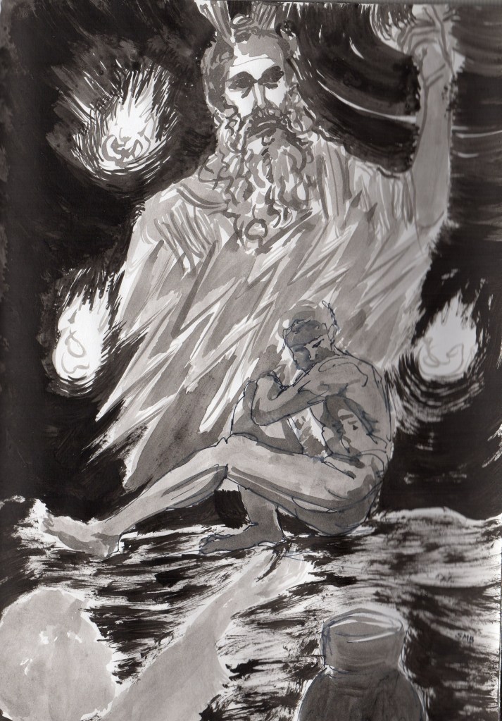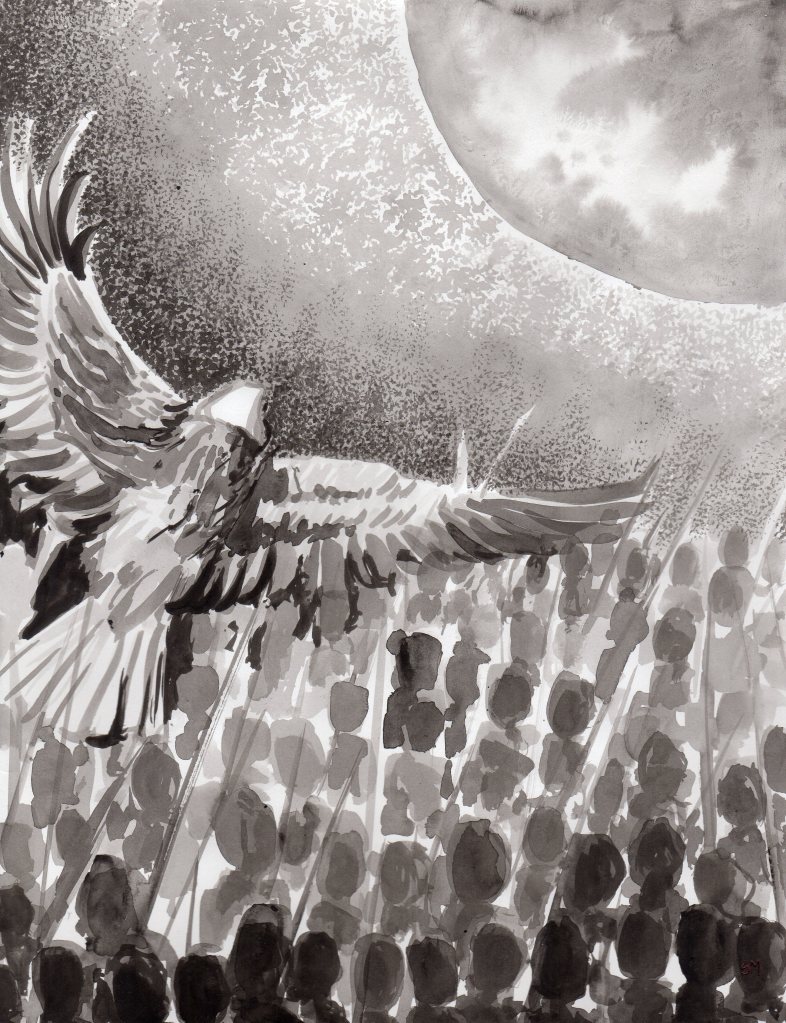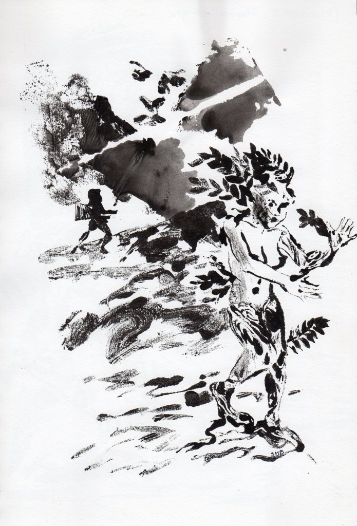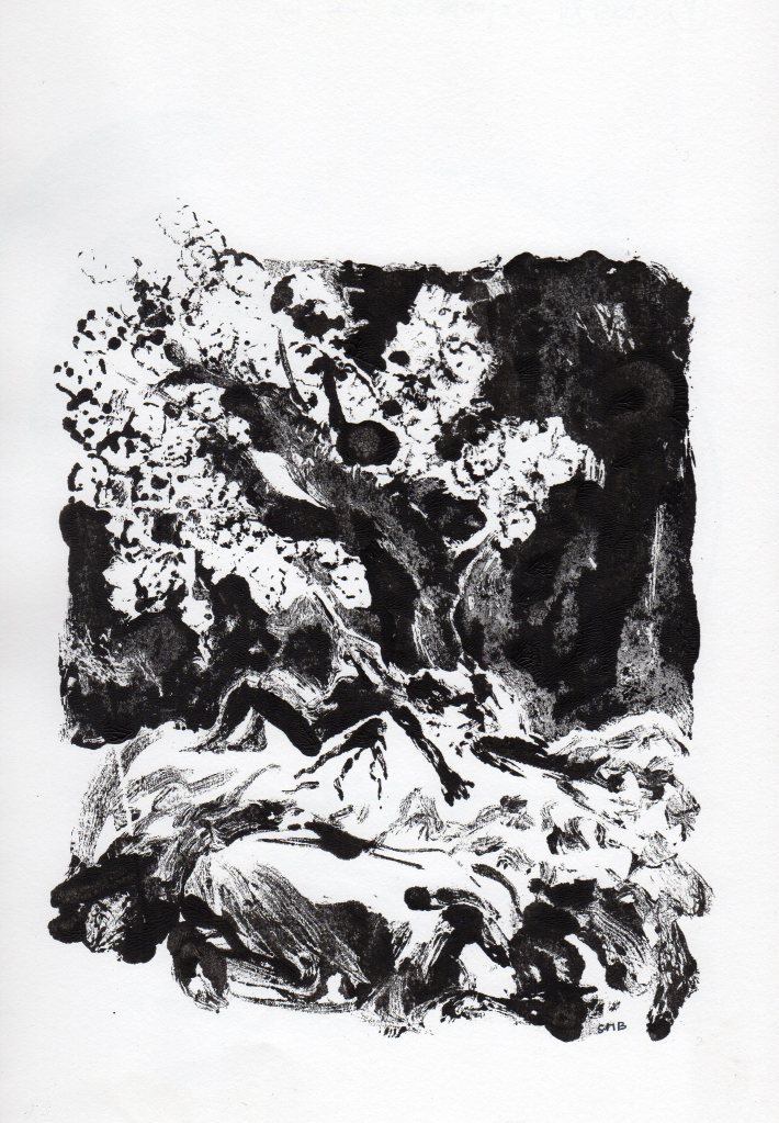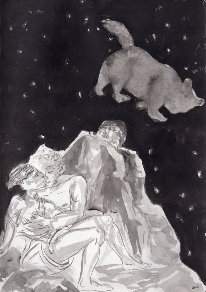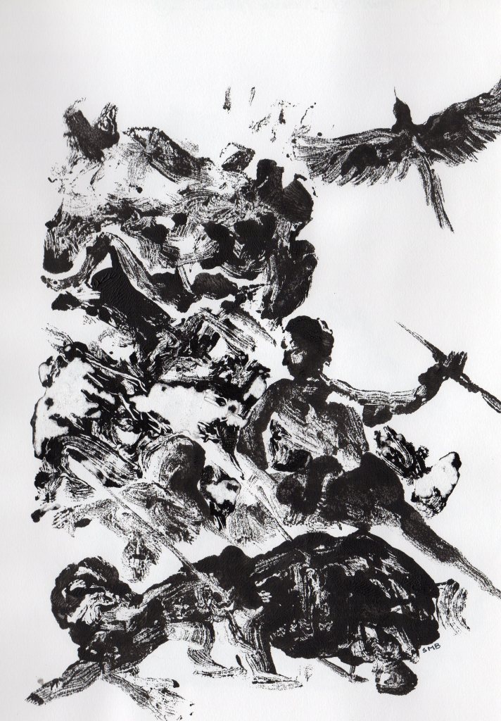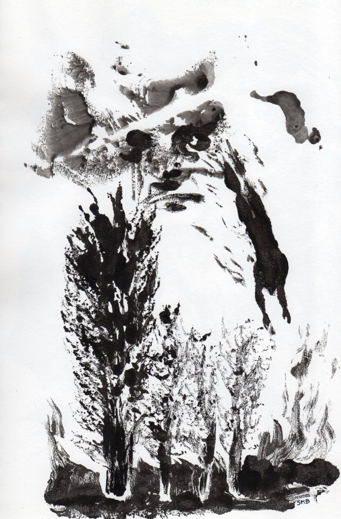 L’installation performative « Quand l’humain ferme les yeux » est fondée sur le modèle de la bipolarité apollinien-dionysien, cher à Friedrich Nietzsche et Aby Warburg. Sur un large tapis de feuilles de laurier et de lierre, l’humain est disposé au centre, recroquevillé et recouvert d’une bâche composée par des sacs en plastique blanc de boucherie, cousus de fil blanc. Son visage est tourné vers l’Est. 4 vases-canopes posés sur des cubes et situés aux 4 points cardinaux forment un premier cercle, celui de l’Amour Fraternel. Ils contiennent chacun des matières naturelles et prophylactiques: poivre noir, clous de girofle, sel marin, curcuma. 5 urnes funéraires constituent le deuxième cercle, celui du chaos, du doute, de l’hétérogénéité, de l’humain-citoyen. Ces urnes, placées aux pointes d’un pentagramme, sont celles des 5 Républiques Françaises. Leurs assises sont élaborées à partir du bois et de ses dérivés: cendres, charbon, bois flotté, bois sec. Elles conservent des mots et des phrases: